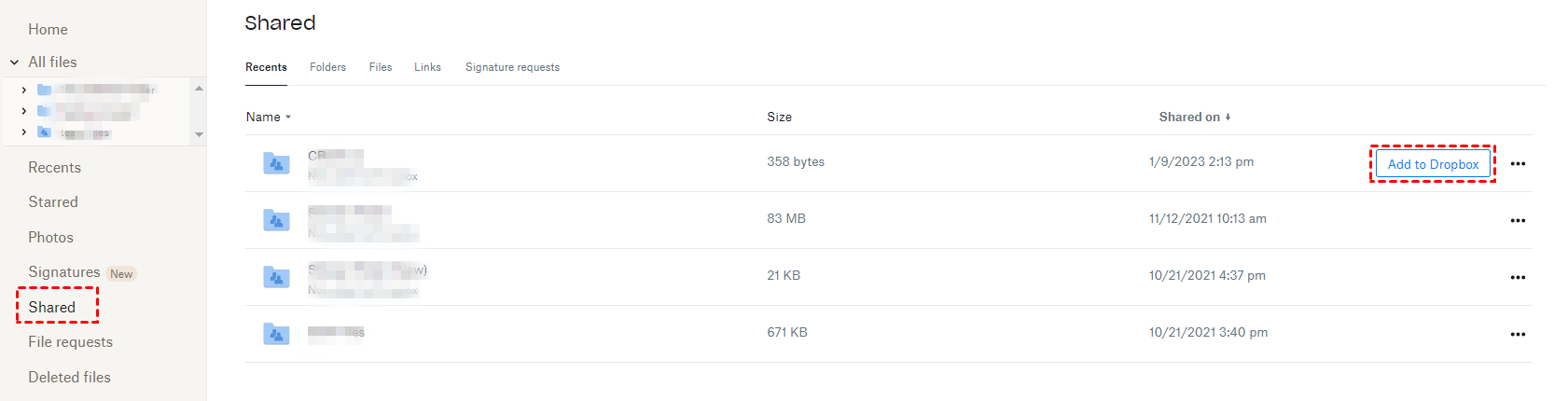 Step 1. Sign in to your individual account. Select Shared and hover over the shared folder you want to move, then click Add to Dropbox.