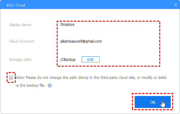 Step 3. Edit Dropbox Cloud name and Storage path, then tick the option “Note: Please don't modify or delete the CBackup path or backup files in your Dropbox account.”, then click OK to add Dropbox.
