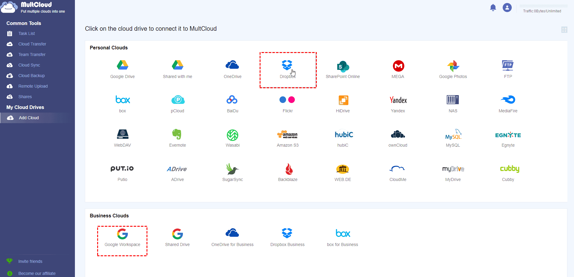 1. Add Dropbox and Google Workspace both to MultCloud.