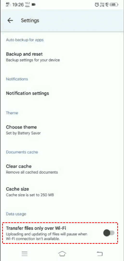 2. Then go to Settings > Data usage, then disable Transfer files only over Wi-Fi, and press OK to confirm.
