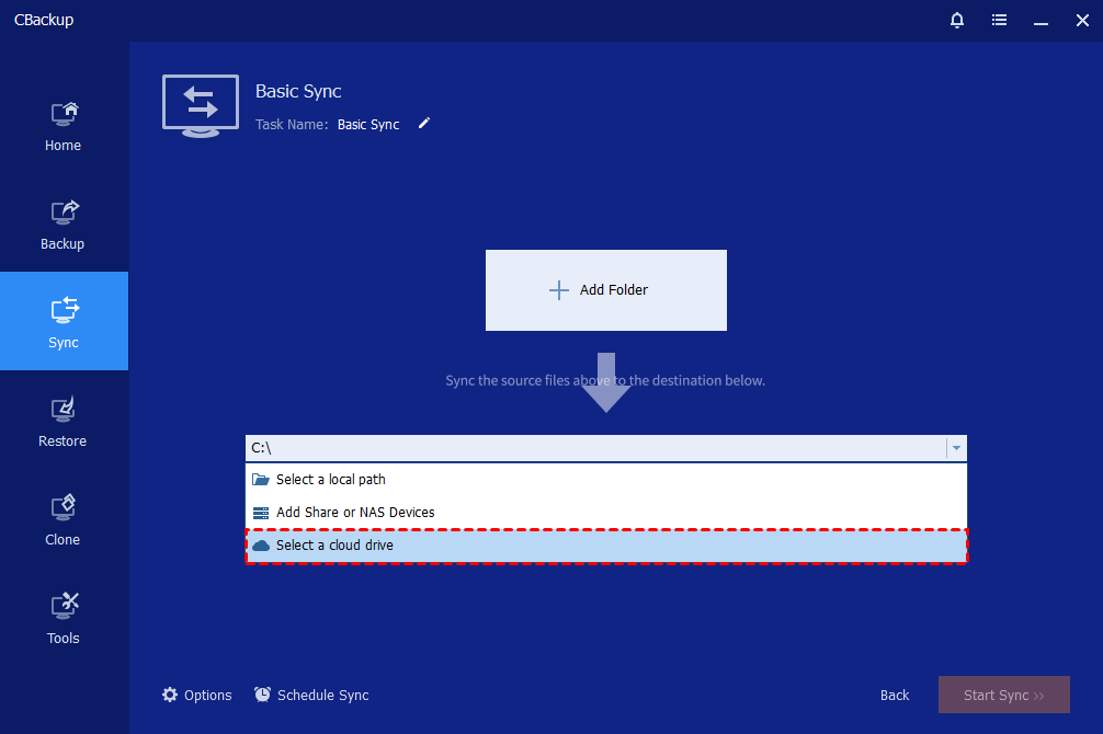 CBackup also allows you to perform a computer backup to OneDrive using its Basic Sync feature. This function operates much like the default copy process in Windows, meaning it does not generate an image file. Therefore, you can easily access and open your synced files at any time.