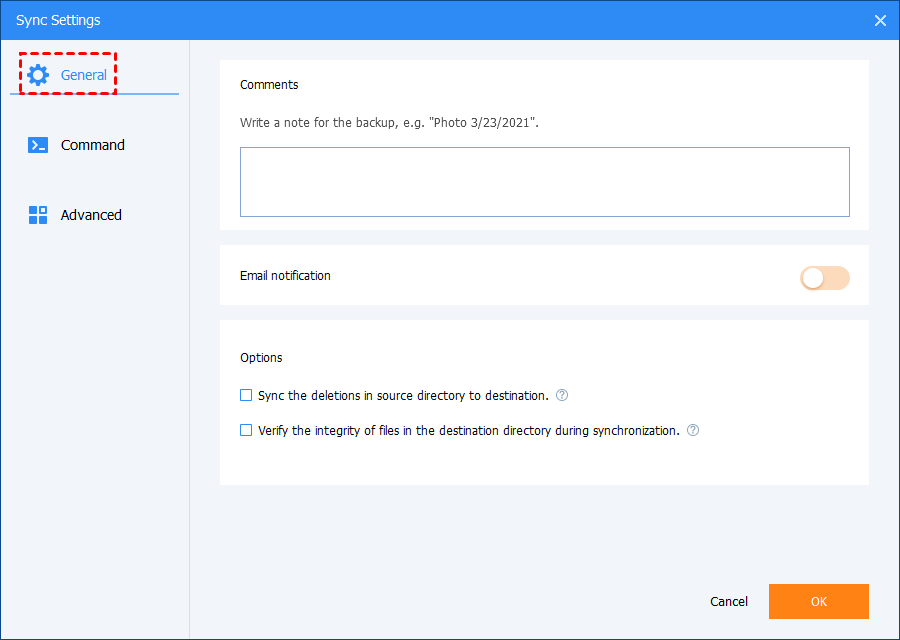 Verify the integrity of files in the destination directory during synchronization: If a file in the source directory does not exist in the destination directory, the missing files will be synced to the destination directory to ensure the integrity of files. (e.g., files in the destination directory are deleted manually.) Tick this option will also increase the sync time.