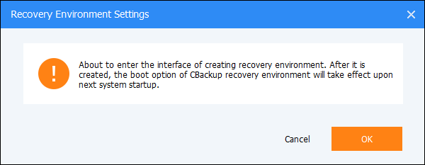 The "Recovery Environment" in CBackup is a tool to help you create a recovery environment with CBackup. With the Recovery Environment tool, you can easily perform system backup restore or other backups restore operations when the system crashes.