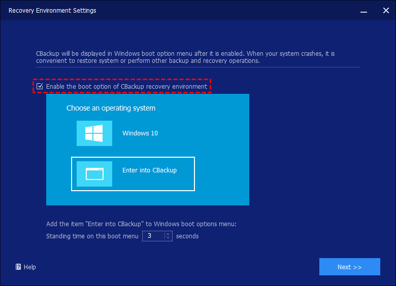 After ticking, the "Enter into CBackup" option will be added to the system boot menu page, so that you can select to start the system from the recovery environment.