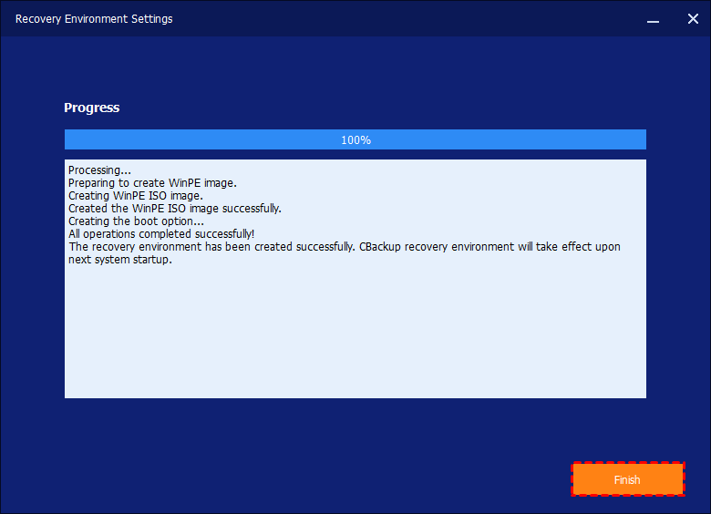 After the creation is successful, please click "Finish". And, settings will be saved. The CBackup system boot option will take effect the next time the system starts.