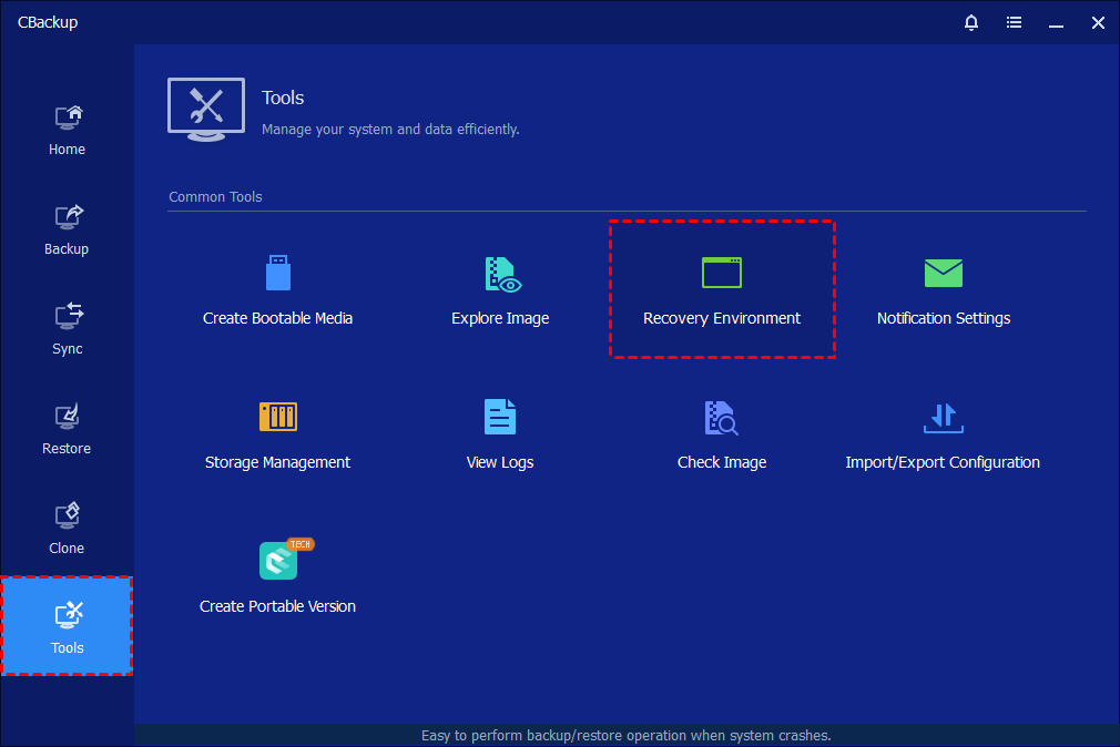 With the Recovery Environment tool in CBackup, you can easily perform system backup restore or other backups restore operations when the system crashes.