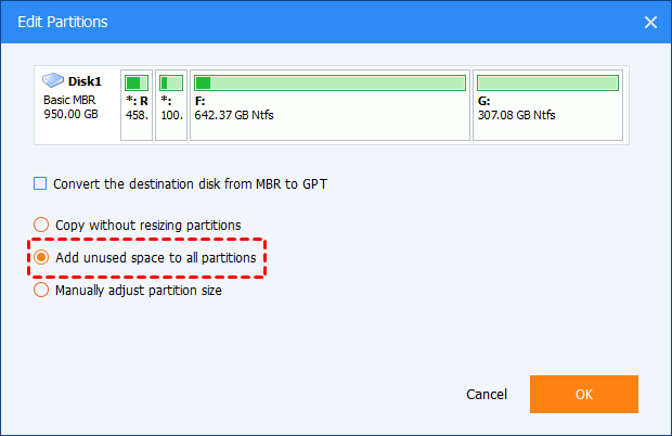 - Add unused space to all partitions: The destination disk partitions will be automatically resized to fit the entire disk, appropriate for the disk size.