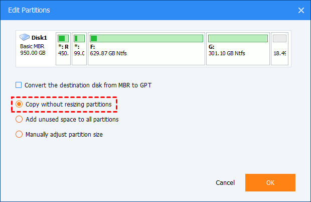 Copy without resizing partitions: Do not make any changes to the partition sizes. If you want to clone disk to larger disk, select the last two options instead.