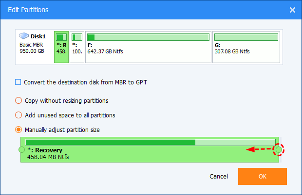 Manually adjust partition size: Manually adjust the partition size by dragging a slider bar. With this feature, you can simply select and modify the size of every partition as your requirements.