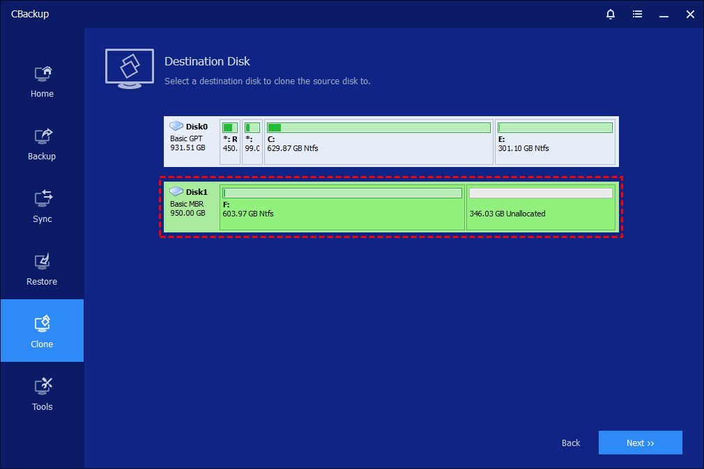 Select the destination disk to which the source disk will be cloned, and click "Next".