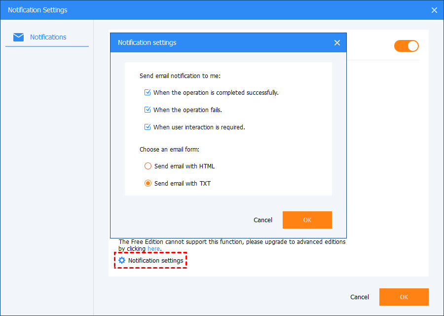 It is a paid feature. If you use the free edition and would like to use the email notification, please upgrade it to the CBackup Professional or Technician version.