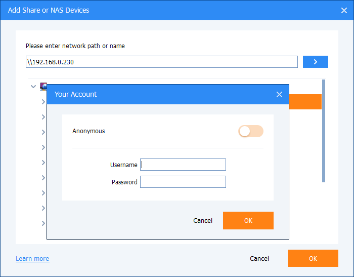 In the Add Share or NAS Devices window, enter the IP address of the network location and click the blue button at the right. You can use an "Anonymous" login. Or, you can disable "Anonymous" and enter the NAS username and password. After the NAS is configured, please click "OK" to save it.