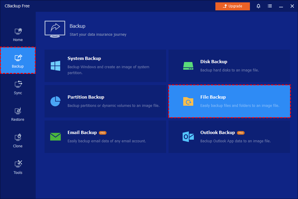 1. Launch CBackup Standard, then click Backup and select File Backup. You can also back up the system, partitions, and even whole disks to a NAS device by choosing other backup types.