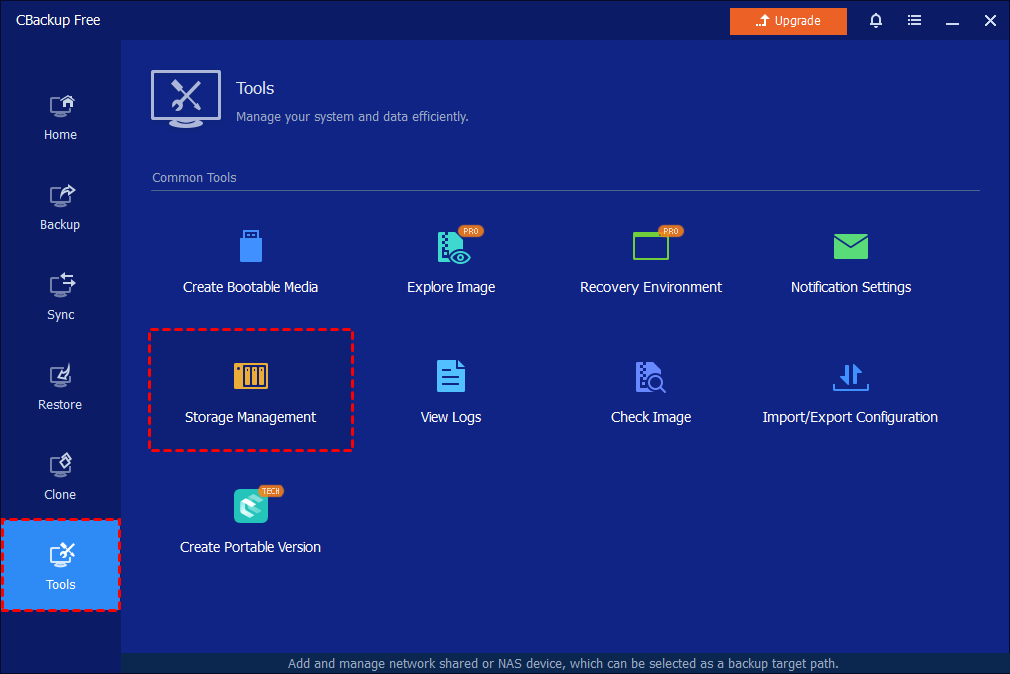 Click the "Tools" button in the left tab, then select the "Storage Management" tool under "Common Tools".