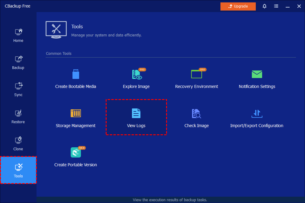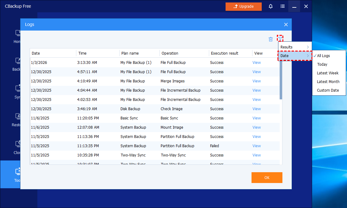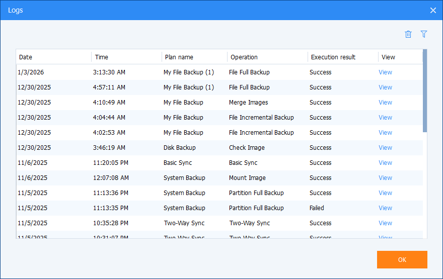 This option provides information about the results of the backup tasks performed. It displays the operation type, the operation result, error code, etc. It is very useful to check the result of a backup when it has been scheduled, for example, and you do not have a result screen to confirm the completion of the operation.