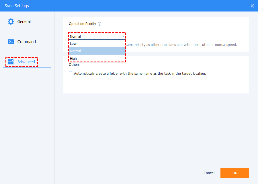 - Others: If you need the same name as the Basic Task folder in the destination, you need to tick the box "Automatically create a folder with the same as the task in the target location" before you create the basic sync task. (This option is unticked by default.)