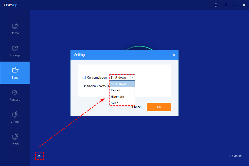 - While sync is running, you can click an icon in the lower-left corner to set to Shut down/Restart/Hibernate/Sleep PC after sync completion.