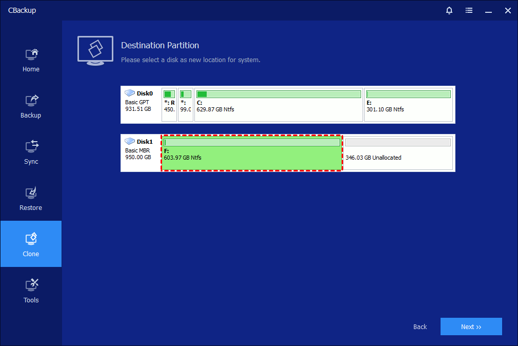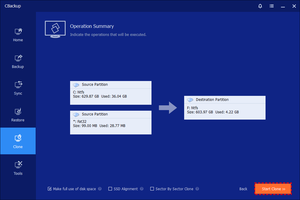 You can easily perform a system clone to another drive, HDD, or SSD, with a reliable system migration software - CBackup Professional. It supports cloning all kinds of disks, regardless of disk type (MBR, GPT) and interface (SATA, NVMe, M.2, PCIe, etc). And it also provides other highlight features to make this process easier, such as Make full use of disk space, SSD Alignment, Sector by Sector Clone, etc.