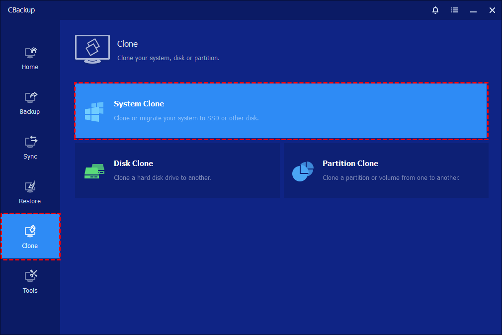 Launch the system migration software - CBackup Professional. Click Clone on the left column, and then select System Clone.