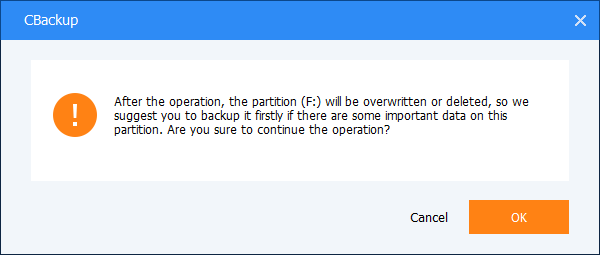 If the selected destination location is partitioned, a window will pop up to prompt that this partition will be deleted or overwritten. Click "OK" to continue. Please make sure that there isn't important data on this partition, or else it will be overwritten.