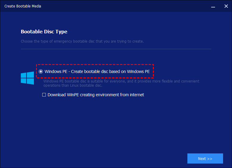 Step 2. At "Bootable Disc Type", select the "Windows PE" option. The created bootable media will support booting from both legacy/MBR and UEFI/GPT.