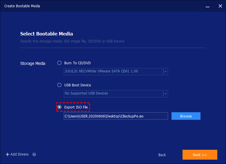 Step 3. At "Select Bootable Media", choose "USB Boot Device" or "Export ISO". Click "Next" to start the process. Wait for the process to complete, and then shut down your computer.