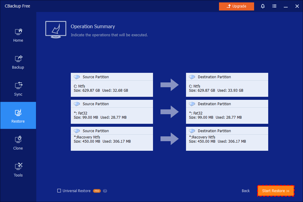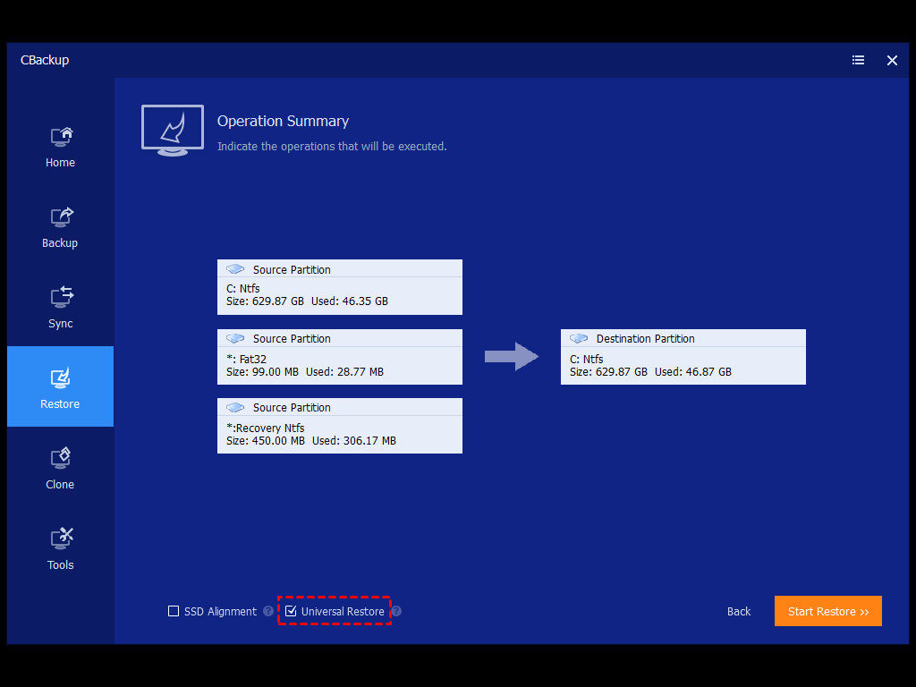 Click the Restore tab and follow the on-screen instructions to run CBackup until you are in the Operation Summary window. Please be sure the "Universal Restore" feature is checked. If not, please check it and then click Start Restore.