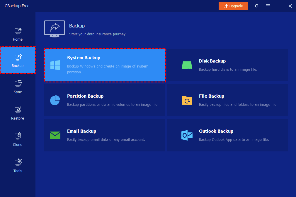Step 1. Launch CBackup on your computer. From the main interface, click the “Backup” option in the left-hand panel, then choose “System Backup.” The program will automatically identify and display all system-related partitions required for a complete backup.