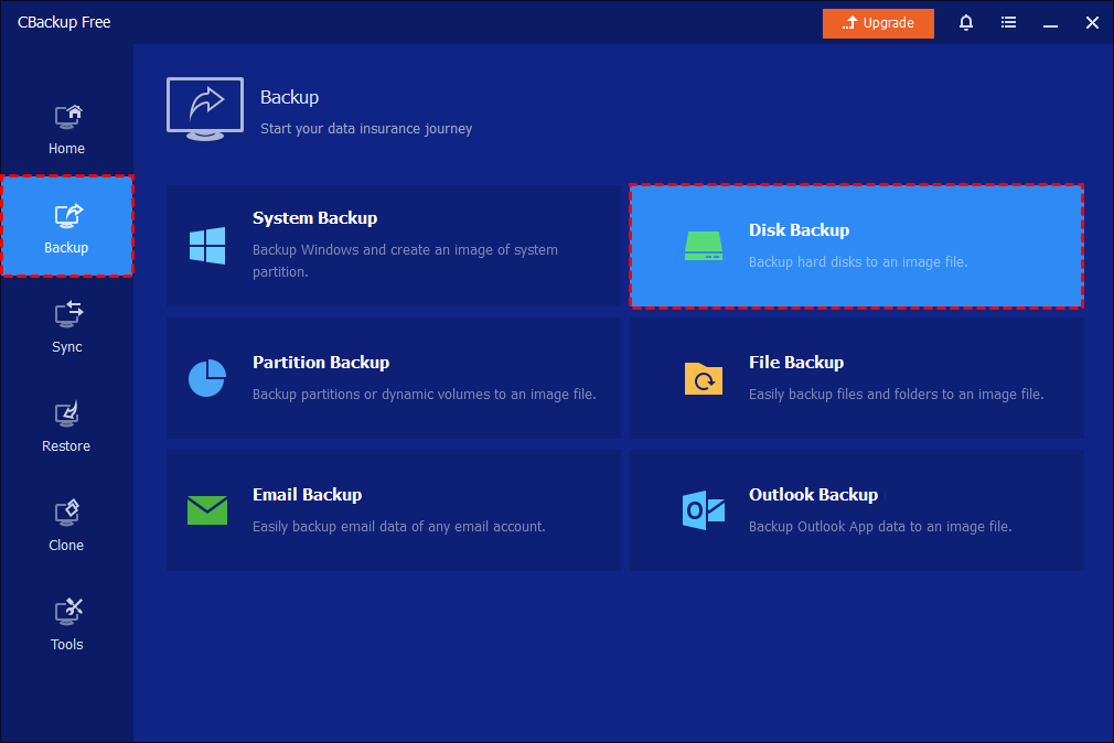Step 1. Launch CBackup on your computer after installation, then go to the Backup section from the left panel and choose Disk Backup to begin creating a full image of your laptop disk.