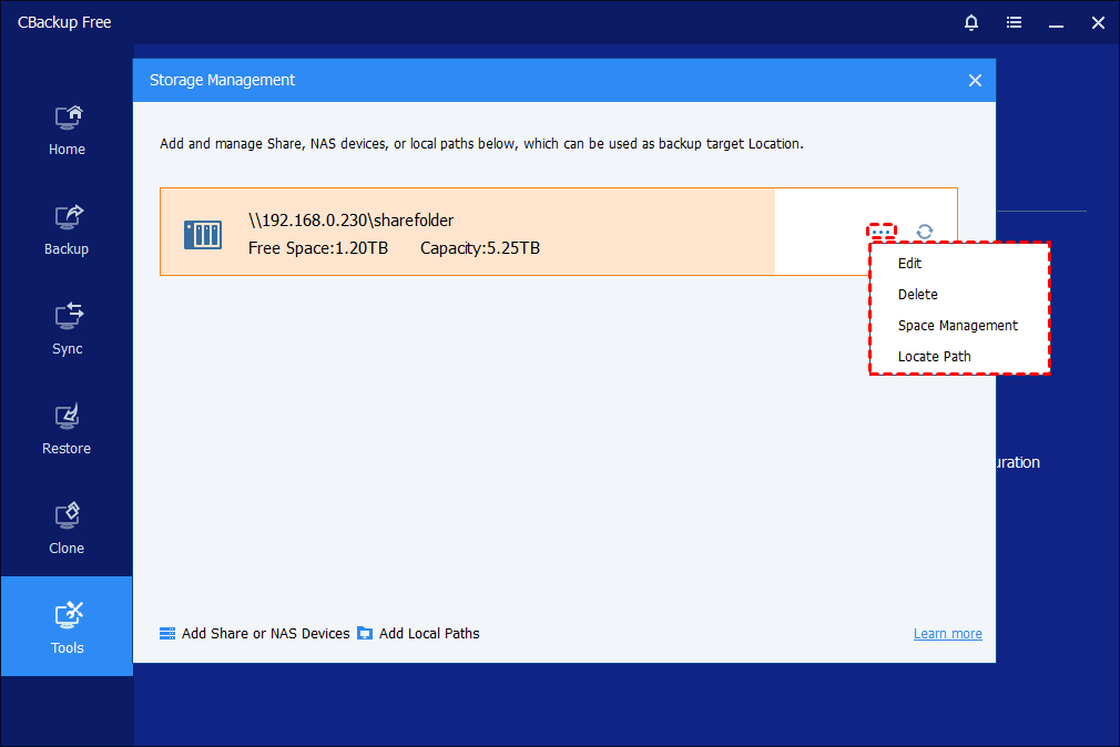 Step 1. Open CBackup and go to the Tools tab on the left panel. Select Storage Management under “Common Tools,” then click Add Share or NAS Devices.