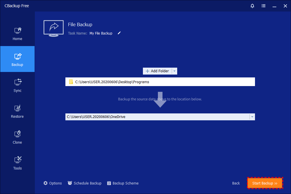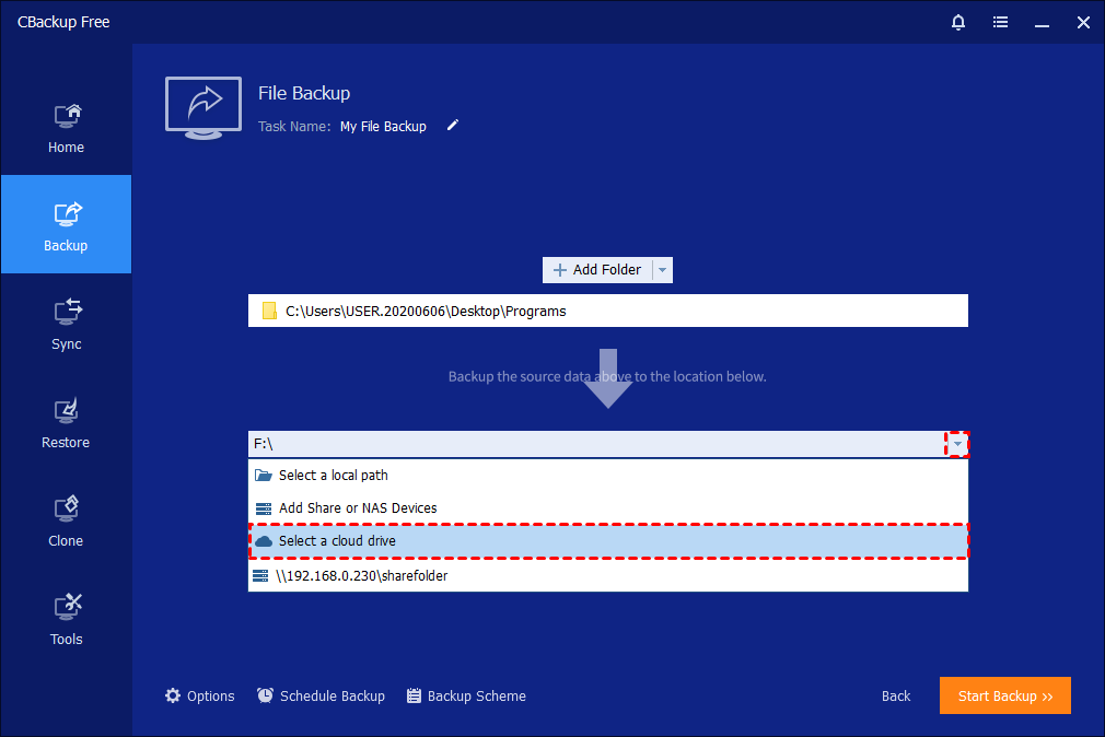 Only a File Backup or Sync task supports selecting a cloud drive as the destination location.