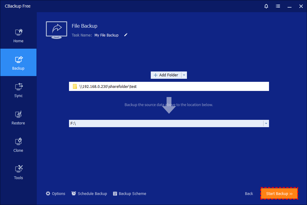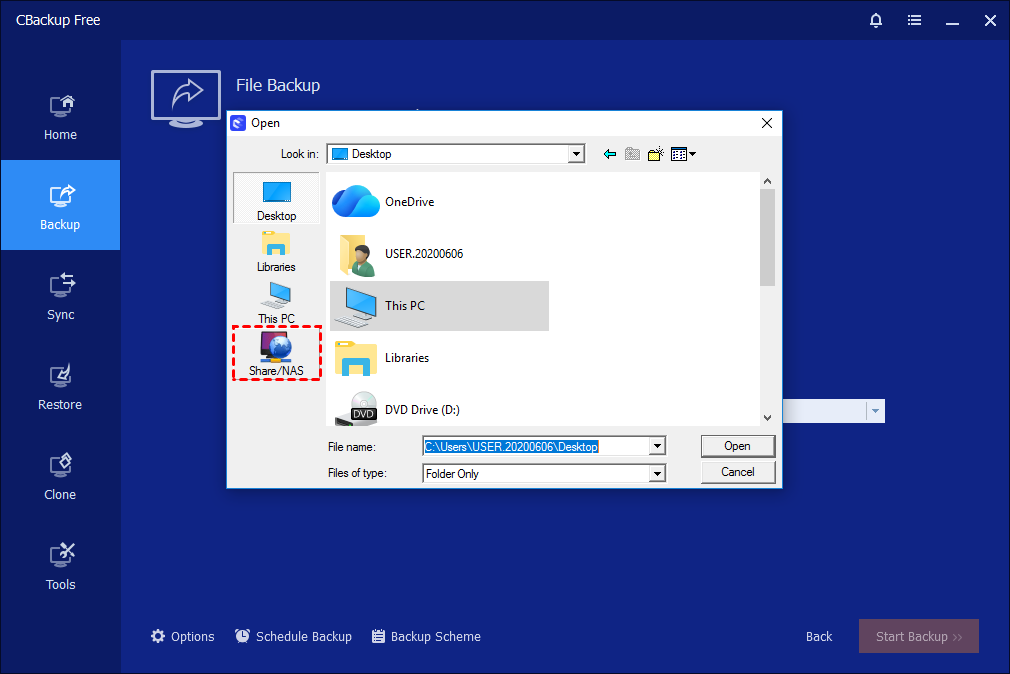 Step 1. Click Backup on the left pane and select File Backup. Click Add File or Add Folder. In the pop-up window, click Share/NAS.